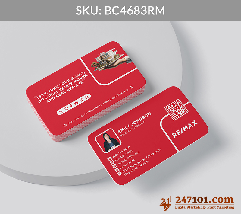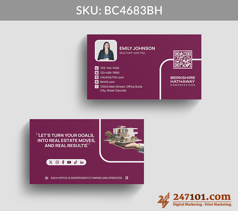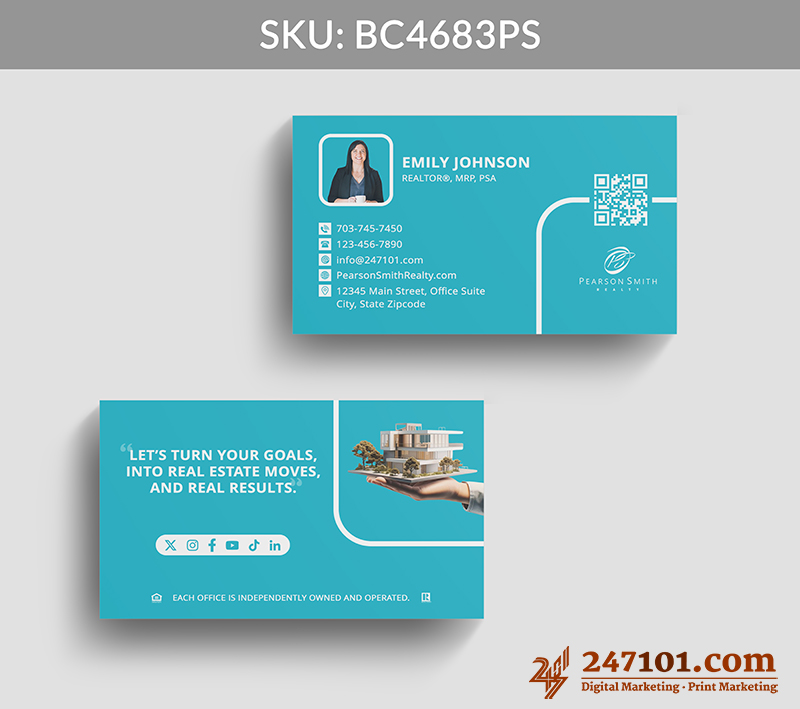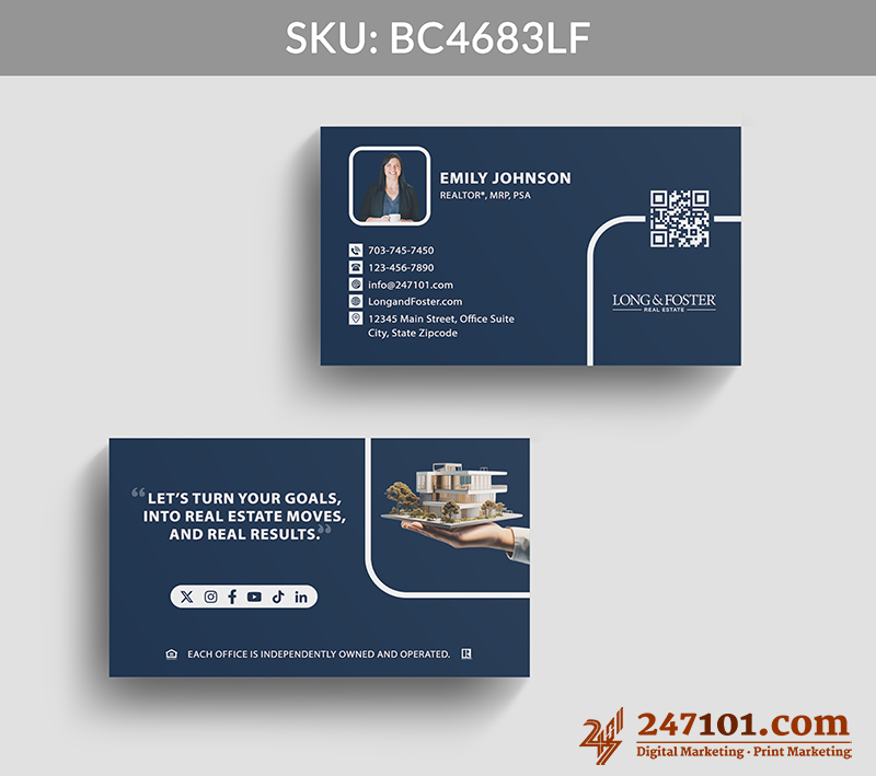 The back features a property graphic, real estate quote, and social icons, creating memorable, meaningful interactions while showcasing your expertise and digital accessibility.