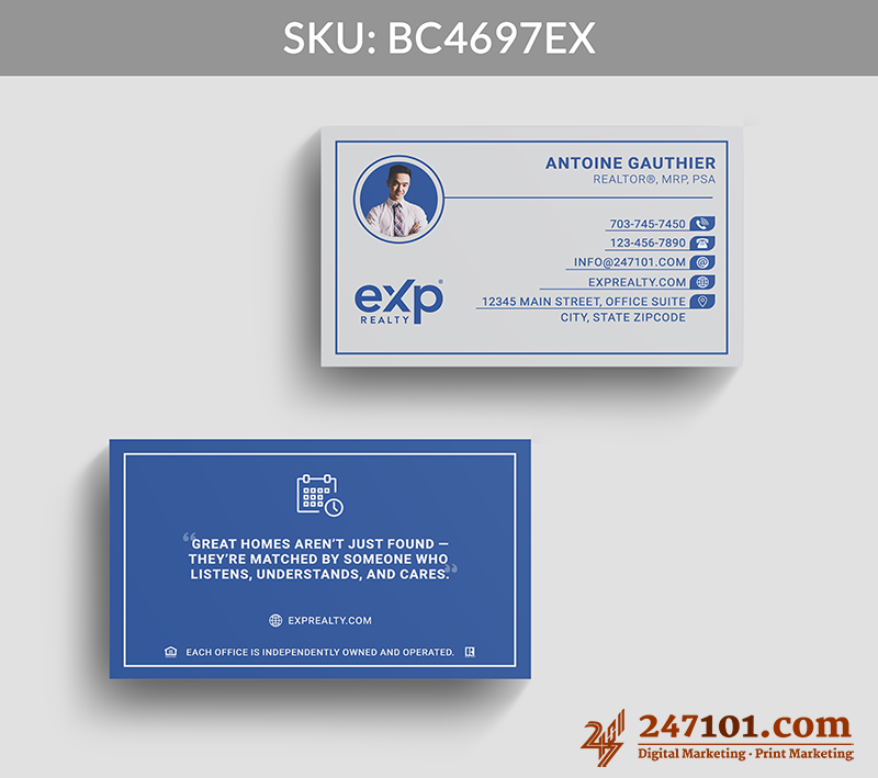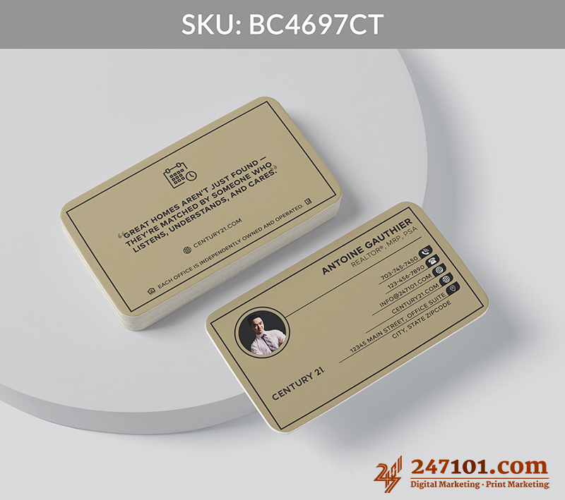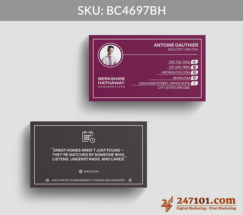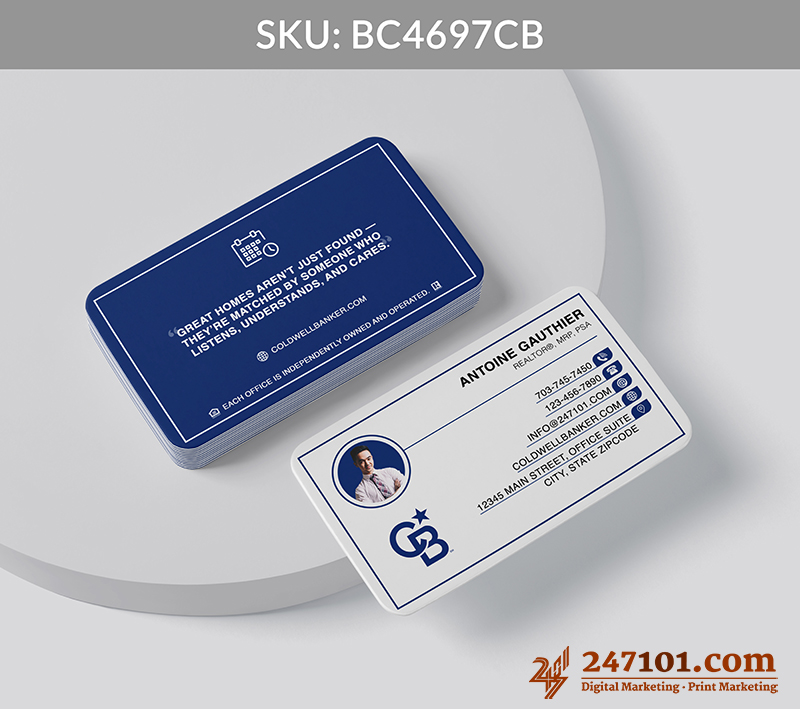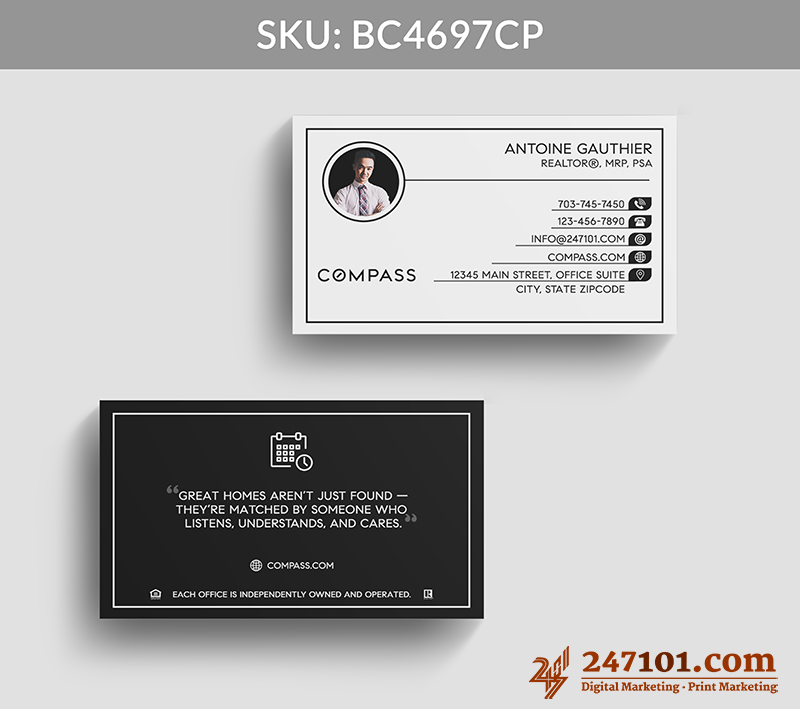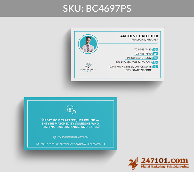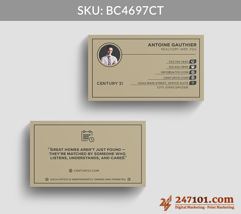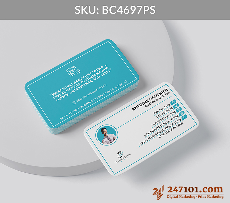 Establish instant recognition and trust with a front layout that pairs your profile image alongside your brokerage logo, giving clients a personal and professional connection from the first glance.
