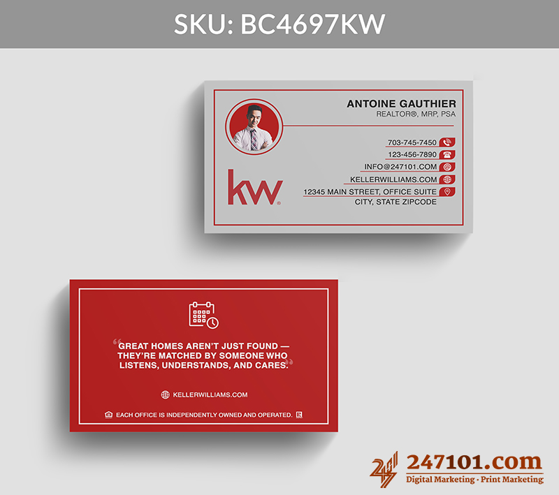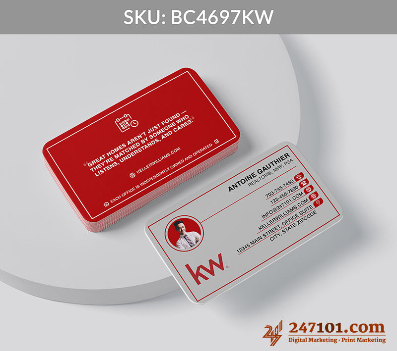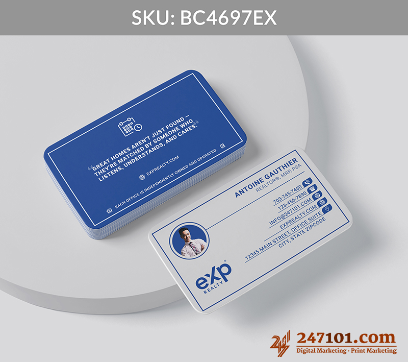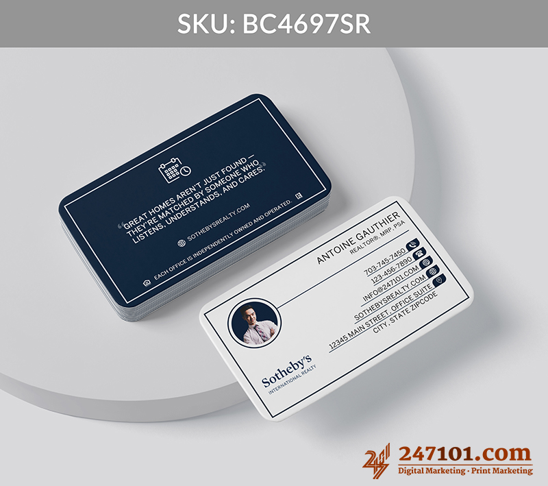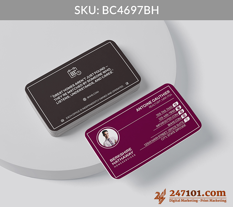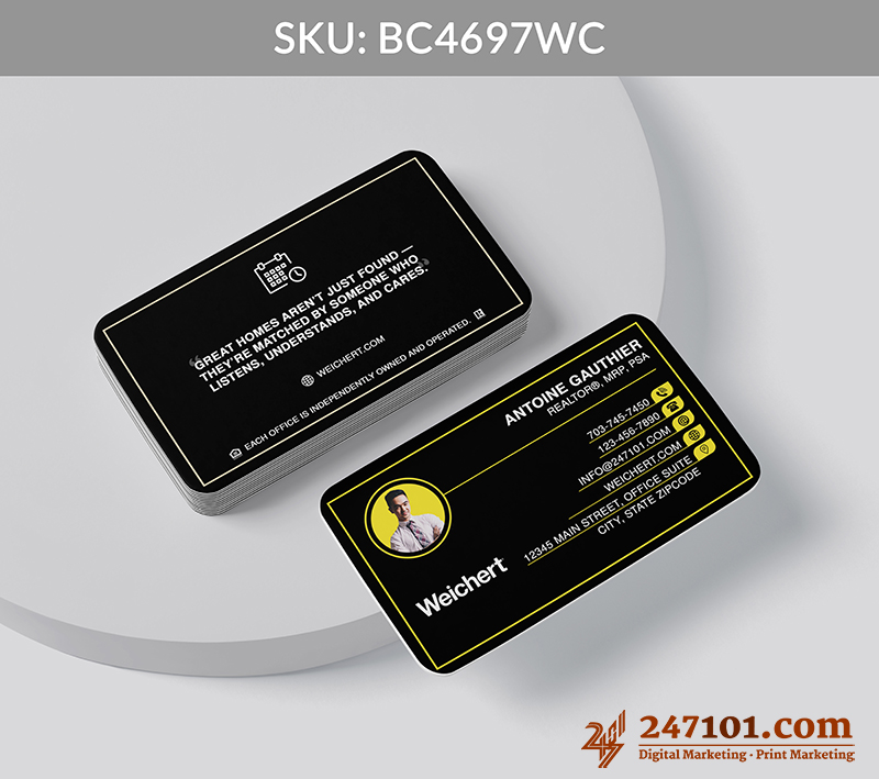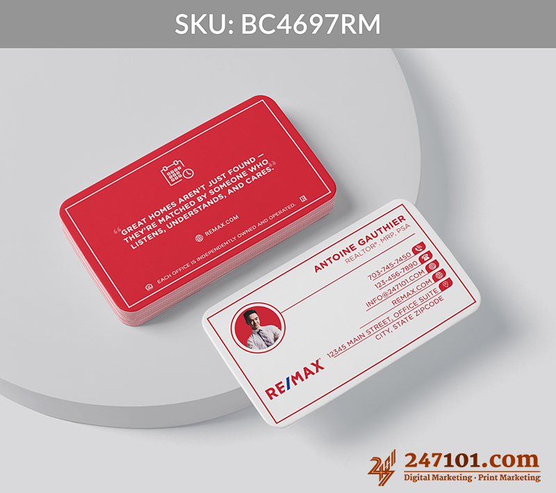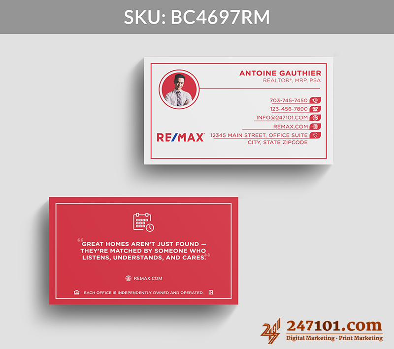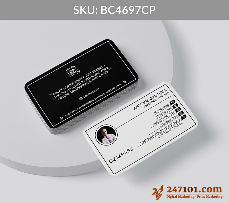 Establish instant recognition and trust with a front layout that pairs your profile image alongside your brokerage logo, giving clients a personal and professional connection from the first glance.